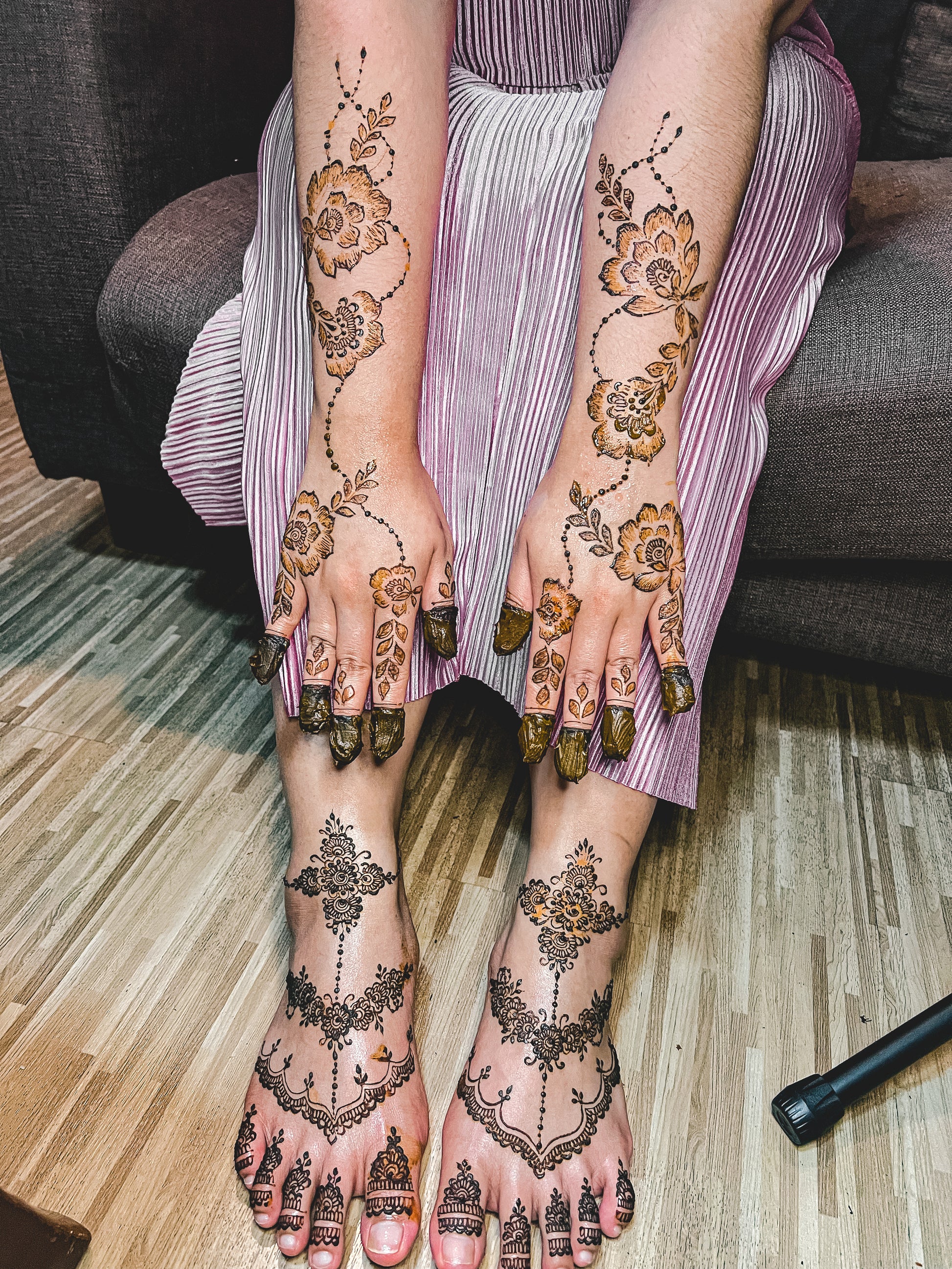 Contrary to the name, white henna is not actual "henna". It's an adhesive body paint that may look and feel like actual henna, but it's not - think of it like white glue. While actual henna is made from the leaves of the henna plant itself. It leaves a stain on your body in a red/brown tone. In terms of white henna, it doesn’t contrast with your skin and leaves a dark color tone. It just stays on the upper layer of your skin for a limited set of time.
